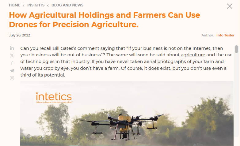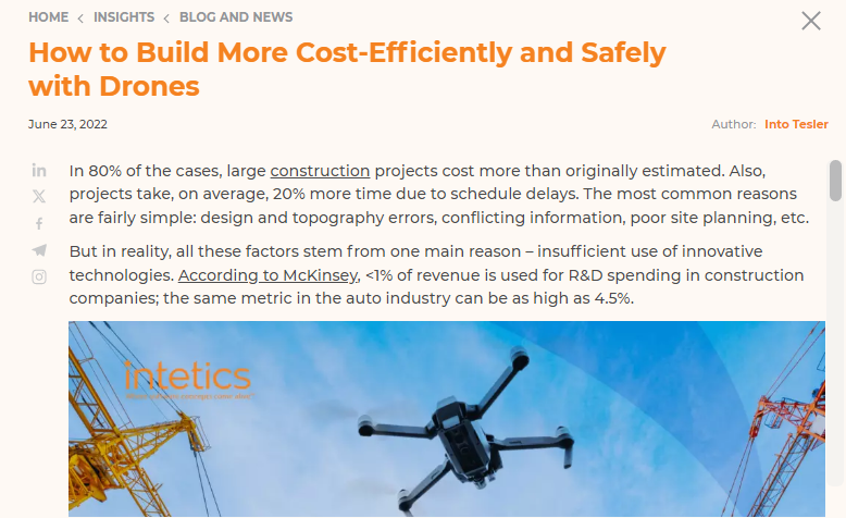 Написал две статьи для блога компании с той же целью: подчеркнуть доменную экспертизу Intetics как разработчика software и hardware-решений для БПЛА. Дроны используются в самых разных отраслях, поэтому важно показать пользу от их внедрения для каждой конкретной области.